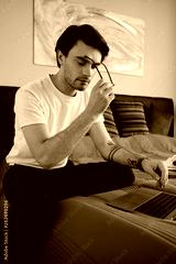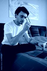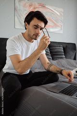 Young pensive brunette man in T-shirt sitting on big bed thoughtfully taking off eyeglasses while working on laptop at modern home