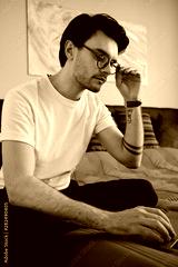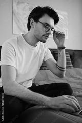 Young handsome brunette man in T-shirt and eyeglasses sitting on bed thoughtfully working on laptop at modern home alone
