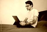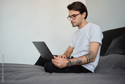 Young handsome brunette man in T-shirt and eyeglasses sitting on bed at modern home thoughtfully working on laptop