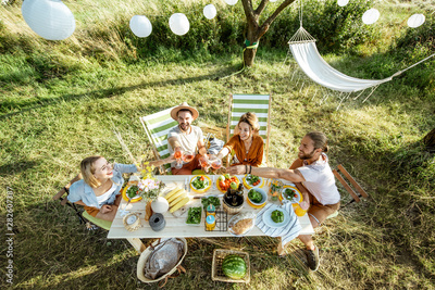 Group of a young friends having festive lunch in the beautifully decorated garden on a summer afternoon, top view