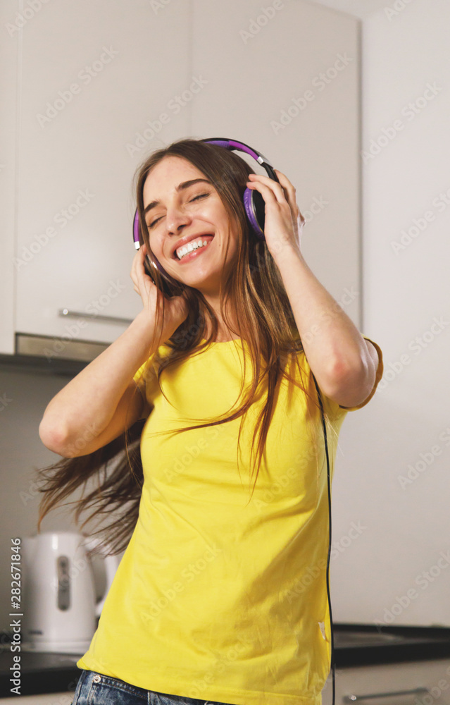 Adorable young brunette smiling woman wearing yellow t-shirt listening music and singing in light kitchen