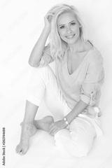 Mature,blonde woman smiling to the camera.
