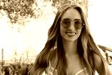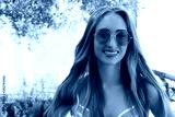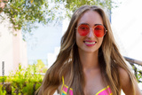 Close Up Happy Woman Face Summer Holidays. Summertime Smile Girl with Blond Hair at summer vacation in swim suit. Selective focus. Pink sunglasses