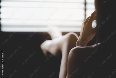 Charming beautiful young woman sitting on the chair near window in the dark room. Attractive beautiful young lady feels loneliness. Gorgeous woman thinking something of her future life. She stay alone