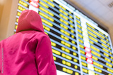 Passenger look at timetables, flight number, departure time, airline on the board of international flight at airport. Passenger has to flight connections to destination. Traveler boarded plane first