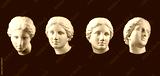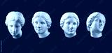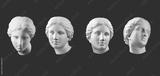 Four gypsum copy of ancient statue Venus head isolated on black background. Plaster sculpture woman face.