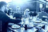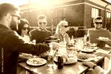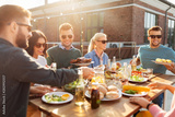 leisure and people concept - happy friends eating and drinking at barbecue party on rooftop in summer