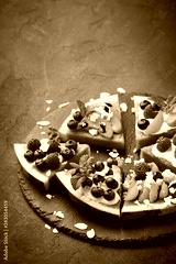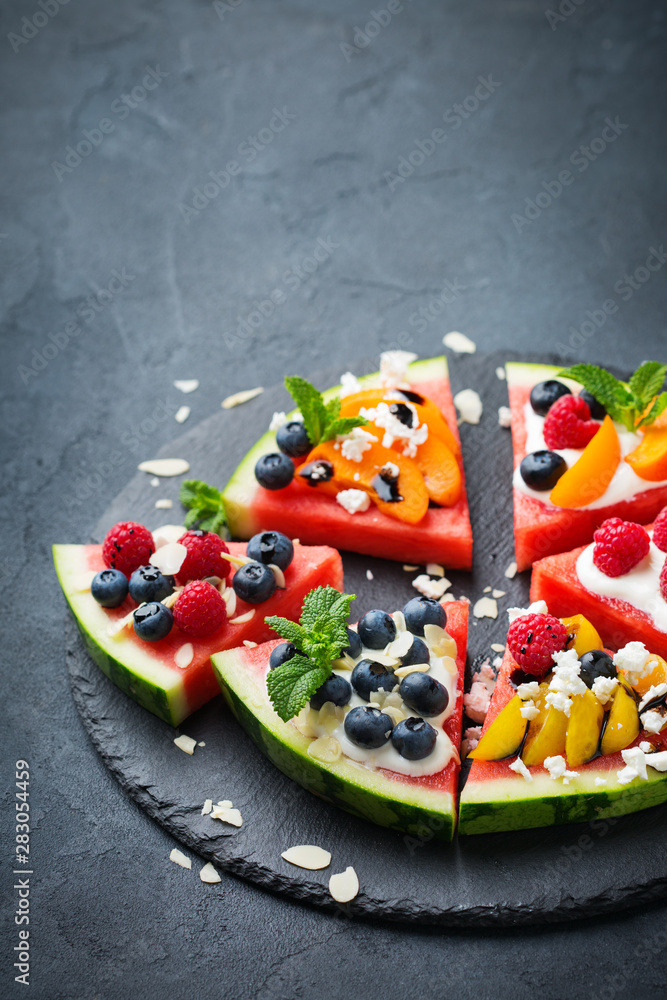 Watermelon pizza with berries, fruits, yogurt, feta cheese