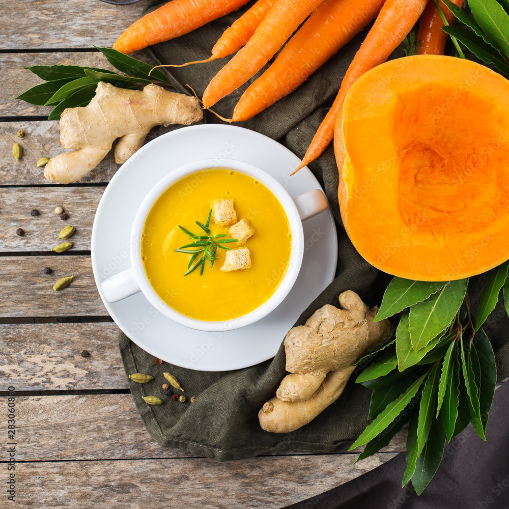 Seasonal spicy fall autumn creamy pumpkin and carrot soup