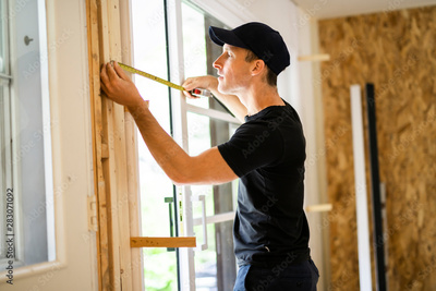 A handsome young man installing Double Sliding Patio Door in a new house construction site