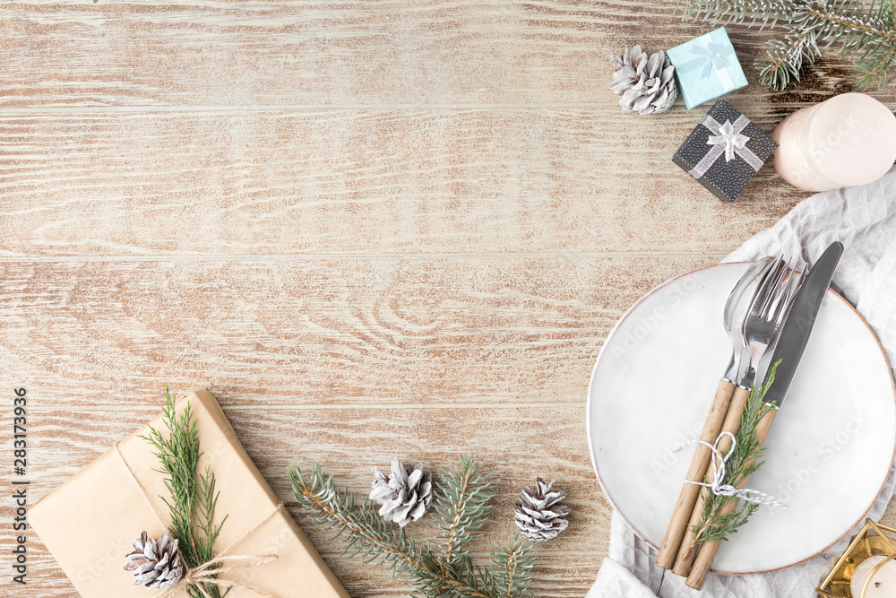 Christmas decoration. Festive plate and cutlery with Christmas decorations. Holiday, New Year background