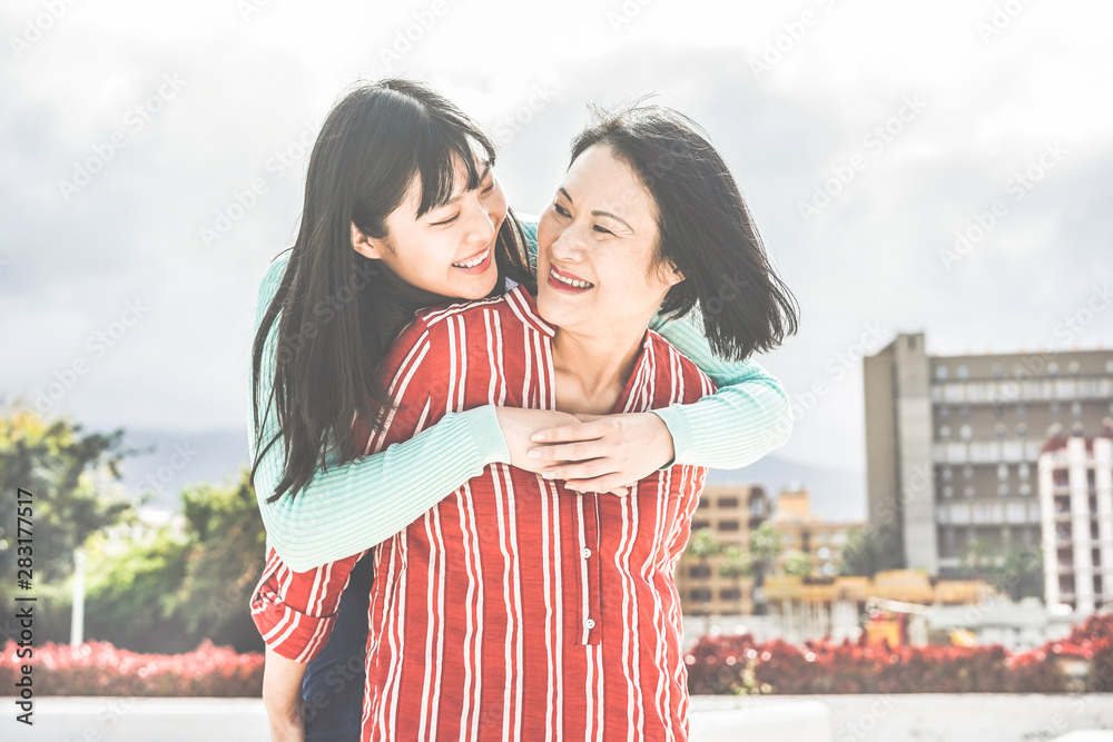 Asian mother and daughter having fun outdoor - Happy family people enjoying time togehter around city in Asia - Love, parenthood lifestyle, tender moments concept - Main focus on girl face