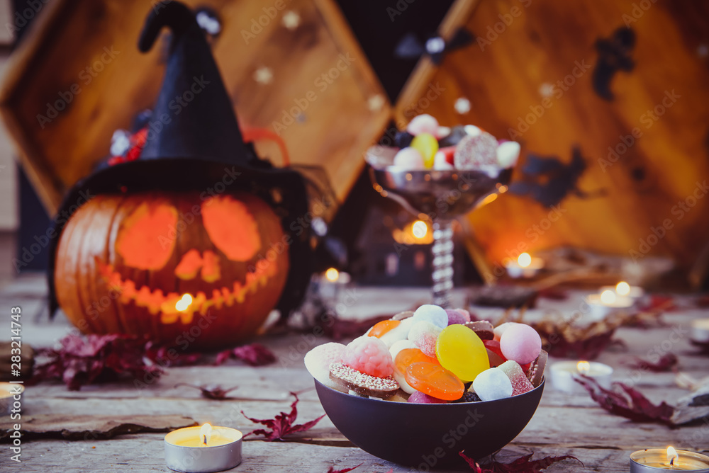 Close up bowl with sweets, candies and carved pumpkin in witch hat with paper silhouettes of bats, castle, ghosts on wooden background. Spooky holiday symbols. Trick or treat concept. Copy space.