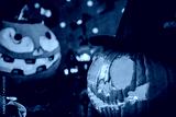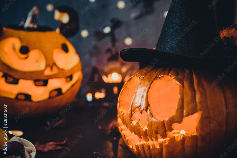 Close up Two Carved luminous pumpkins with scary evil faces, burning candles and paper silhouettes of bats, castle, ghosts on black stone background. Spooky holiday symbols and celebration concept.