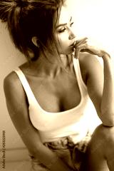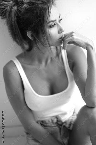 Black and white portrait of beautiful brunette model.