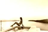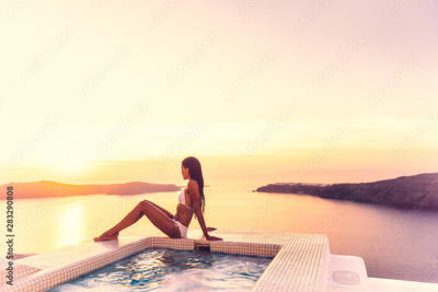 Luxury resort vacation bikini model woman relaxing lying down by hot tub jacuzzi private swimming pool hotel room suite balcony sunset over the Aegean sea in the Cyclades islands, Santorini, Greece.