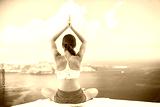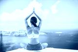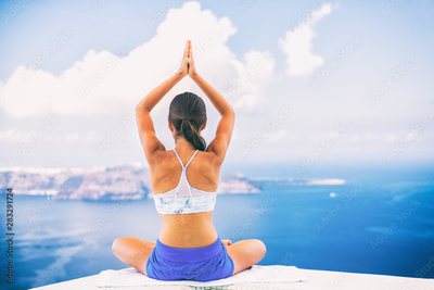 Woman doing yoga meditation in morning sunshine nature landscape- relaxing in beach background.