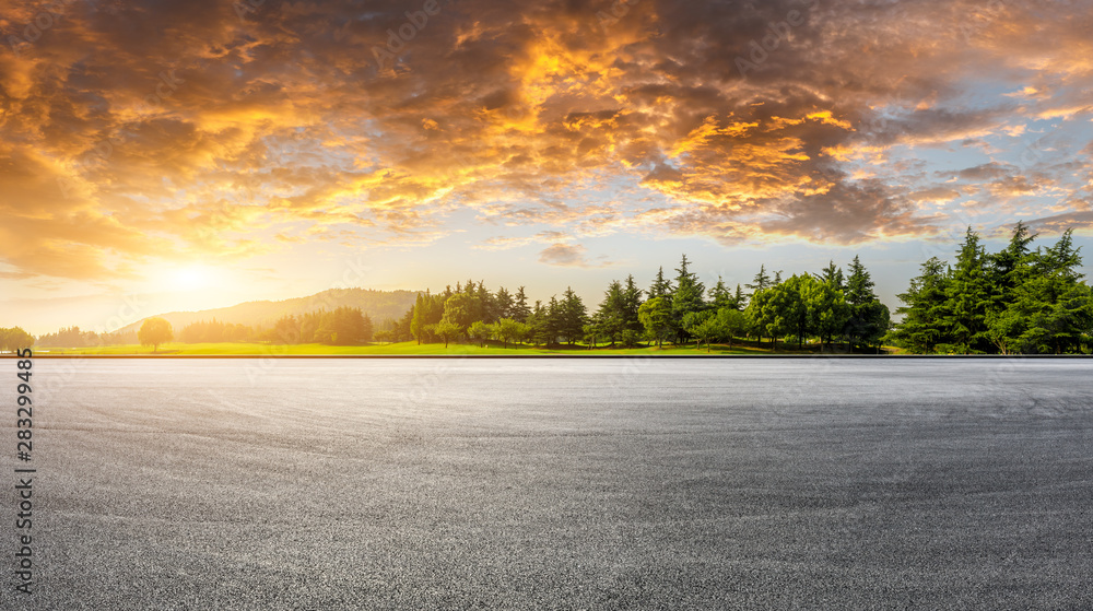 Wide race track and green woods nature landscape at sunset