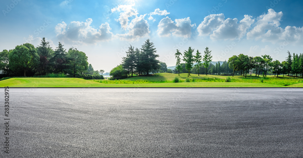 Asphalt race track and green woods nature landscape in summer