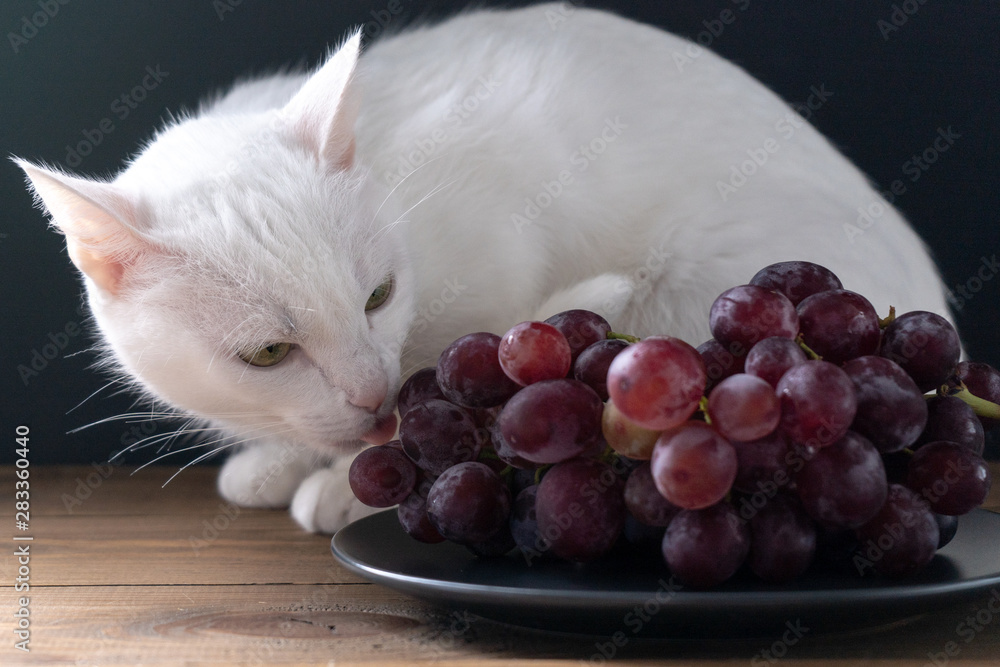 Bunch of ripe purple grapes in a bowl and a white hungry interested cat on a wooden table on the black background in the dark. Close-up. Side view