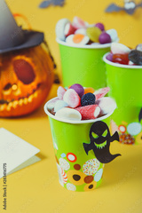 Halloween trick or treat sweets. Paper cups with colourful candies inside and paper silhouettes of bats, ghosts, witch on bright yellow background. Spooky holiday symbols. Vertical card. Copy space.