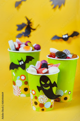 Halloween trick or treat sweets. Paper cups with colourful candies inside and paper silhouettes of bats, ghosts, witch on bright yellow background. Spooky holiday symbols. Vertical card. Copy space.