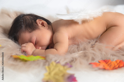 Cute little angel or newborn baby sleeping. Cute infant baby girl has little wings on back. Beautiful asian newborn has good health and sweet dreams. Lovely child sleeping on cozy bed at bedroom