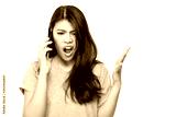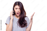 Beautiful young woman gets disappointed, unhappy, unsatisfied, unbelievable when she talks with boyfriend or customer on phone. She has argument with boyfriend or customer and get frustrated. isolated