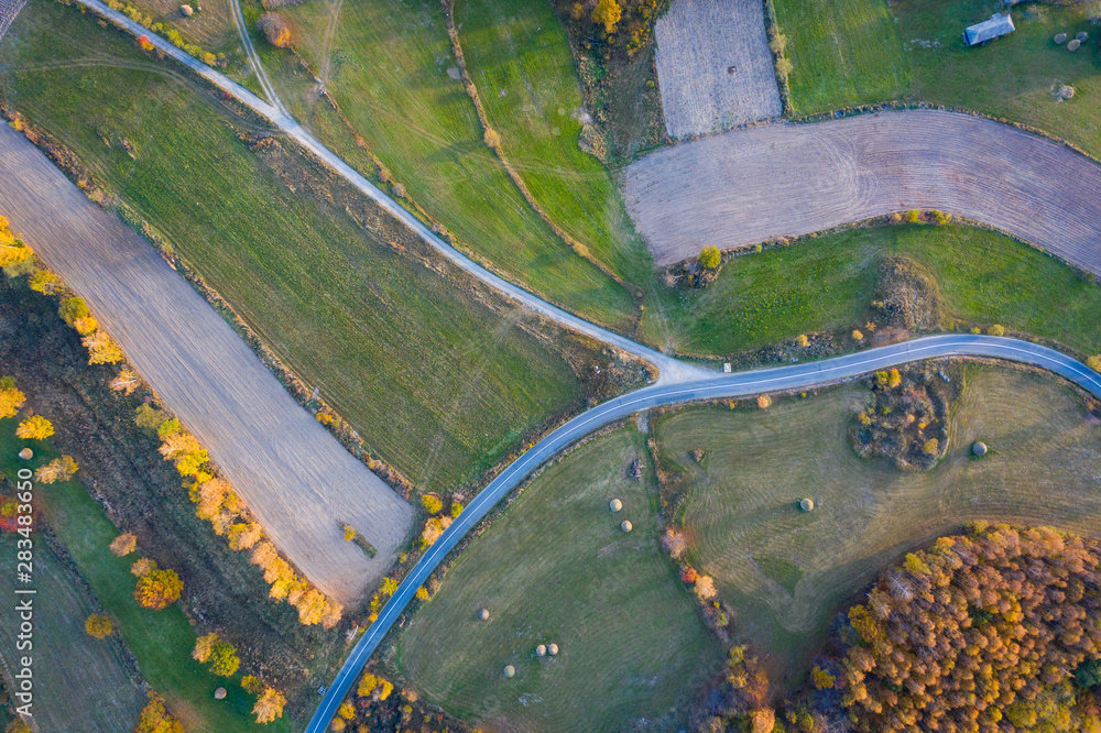 Aerial picture of a countryside village road