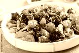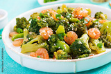 Stir fry shrimp with broccoli close up on a plate. Prawns and broccoli.