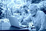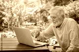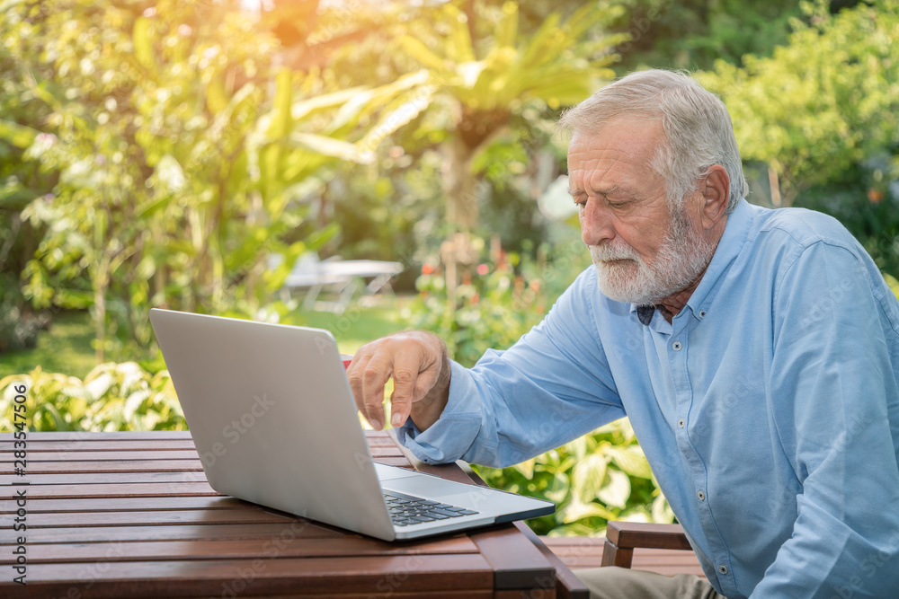 Senior man executive with white hair using typing computer laptop working at home with coffee