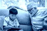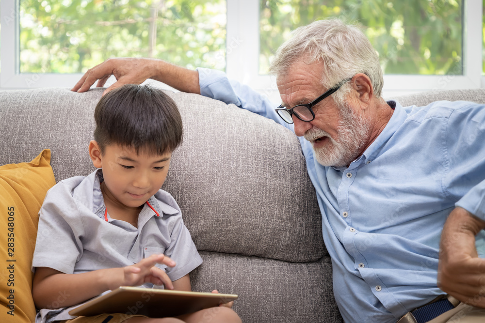 Happy boy grandson playing game on tablet with old senior man grandfather at home