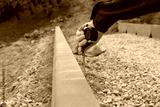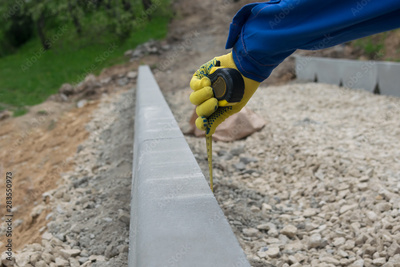 the hand of the employee of the quality department checks the correctness of the roadwork, close-up