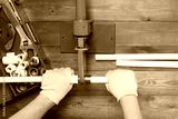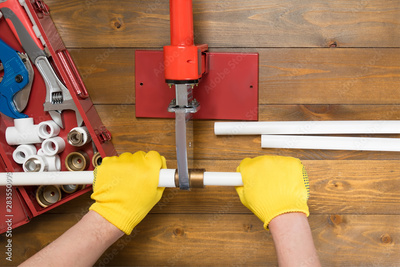 hands in yellow gloves connect plastic pipes with a special soldering iron