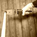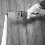 hand holds a soldering iron for soldering plastic pipes for water supply