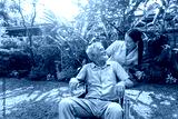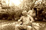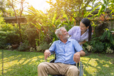 Happy nurse take care elderly man on wheelchair in garden at nursing home