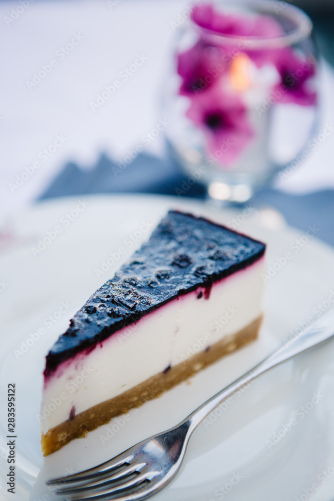 Piece of cheesecake with black currant on white plate