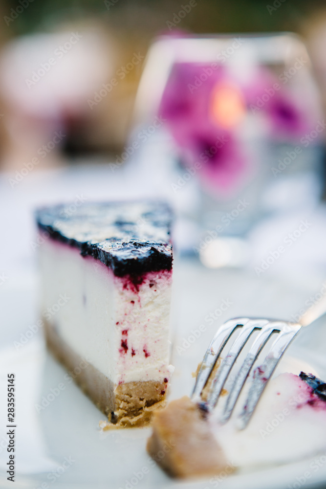 Piece of cheesecake with black currant on white plate