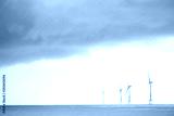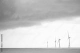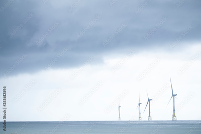 Wind turbines at electric power farm in the North Sea in Aberdeen for renewable energy production and environment conservation