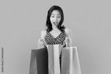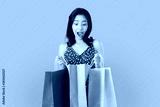 Surprise asian woman for gifts in the shopping bags on light blue background.