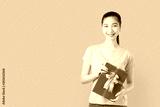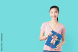 Young smiling Asian woman in pink t-shirt holding blue gift on light background.