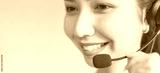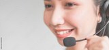 Smiling Asian woman consultant wearing microphone headset of customer support phone operator at workplace.