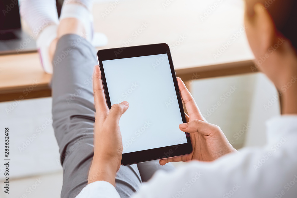 Man holding digital tablet blank screen and legs are placed on the table to relax, mockup to promote your products.