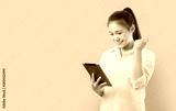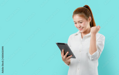 Young smiling Asian woman holding digital tablet with amazed for success on light blue background.