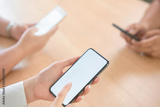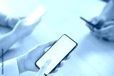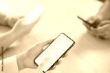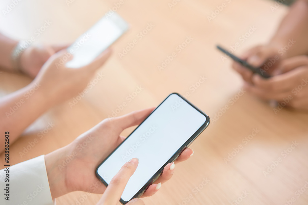 Group of friends holding smartphone with blank screen on table in cafe. Take your screen to put on advertising.