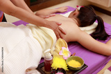 Asian woman enjoying a salt scrub massage at spa.