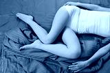 Close up of woman body shiny shaved legs laying on bed in bedroom on blue sheets background at home. Healthy sleeping , fall asleep concept. Feeling refreshed and relax. Nap time. comfortable mattress