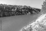 panorama of chalkpit on limestone coast of huge turquoise lake or river near forest. Chalk quarry filled with water