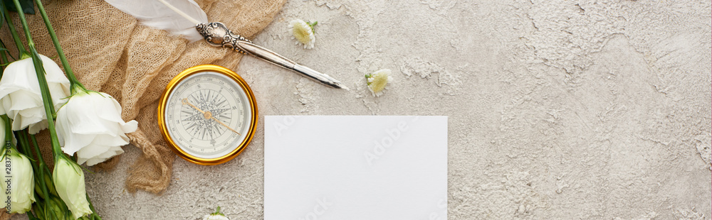 panoramic shot of quill pen on beige sackcloth near white card, golden compass and eustoma flowers on grey textured surface