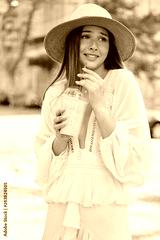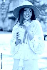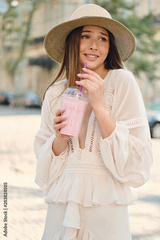 Young attractive woman in white dress and hat holding smoothie to go in hand amazedly looking aside while standing on city street alone